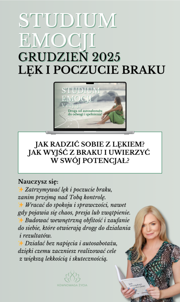 To cykl warsztatów online, stworzony z myślą o osobach, które chcą nauczyć się radzić sobie z emocjami oraz tworzyć swoje życie w sposób bardziej świadomy. Każde spotkanie to doświadczanie innej emocji. Podczas warsztatów, dowiesz się więcej na temat emocji i nauczysz się uwalniać emocje czyli zmieniać swoją energię.